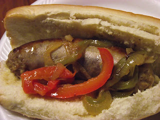 When peppers and onions are soft and sausages are browned, add the sausages to the pan with the peppers and onions. Recover with foil and let steam together for 5-10 minutes on the grill, until sausages are cooked through. (I shake the pan every now and then to prevent the bottom from burning). Remove from grill and let it rest for a few minutes before serving. Serve on buns.