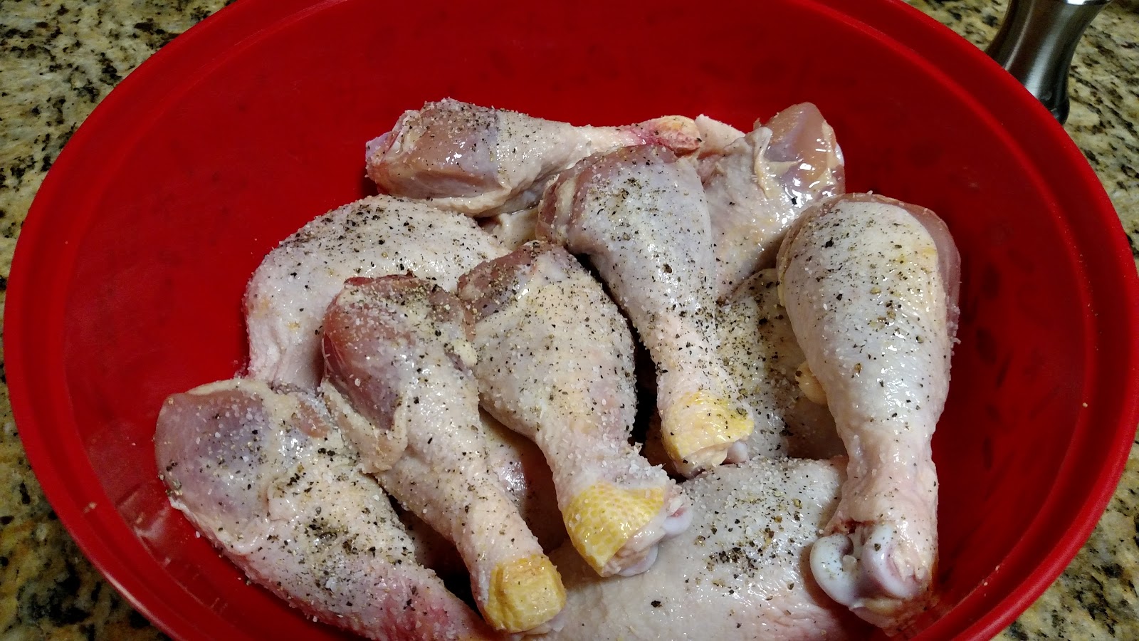 Place the chicken in a single layer (don't pile them on top of each other) on a big baking sheet with sides (I use my gigantic iron skillet). If you don't have a big enough baking sheet, use two.